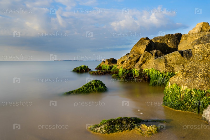 Водоросли на камнях. Спокойное утреннее море. Съемка с длинной выдержкой