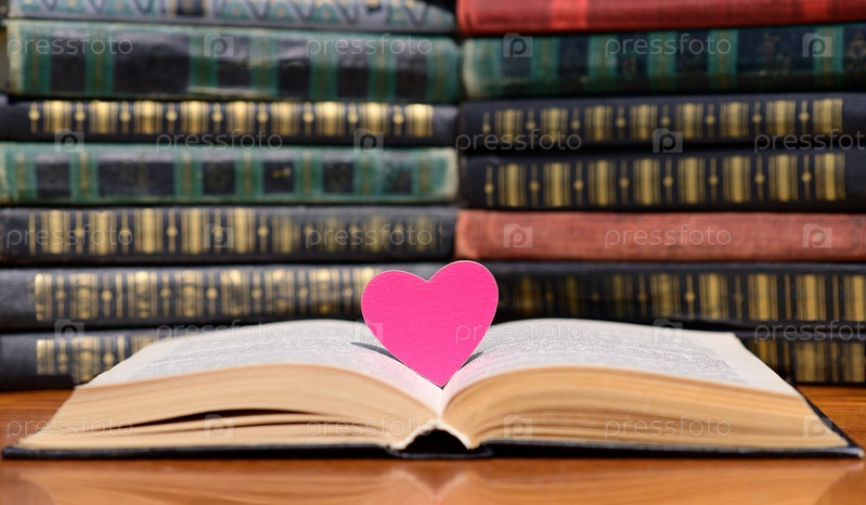 Розовое сердце лежит между страницами в открытой книге. Да на заднем плане груды старых книг