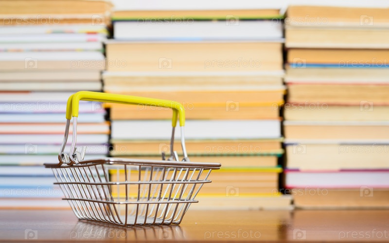 Пустая корзина для покупок стоит на фоне книг. Концепция покупки книг в книжном магазине. Сосредоточение внимания на корзине