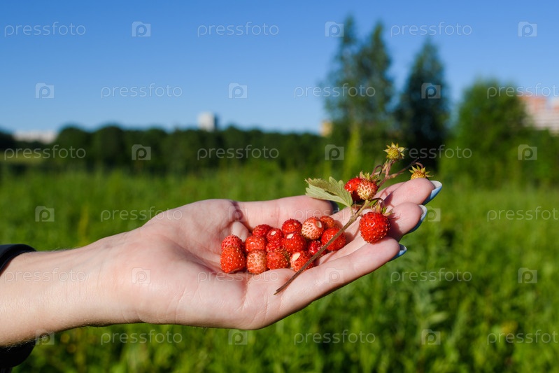 Горсть клубники лежит на руке на фоне природы и города