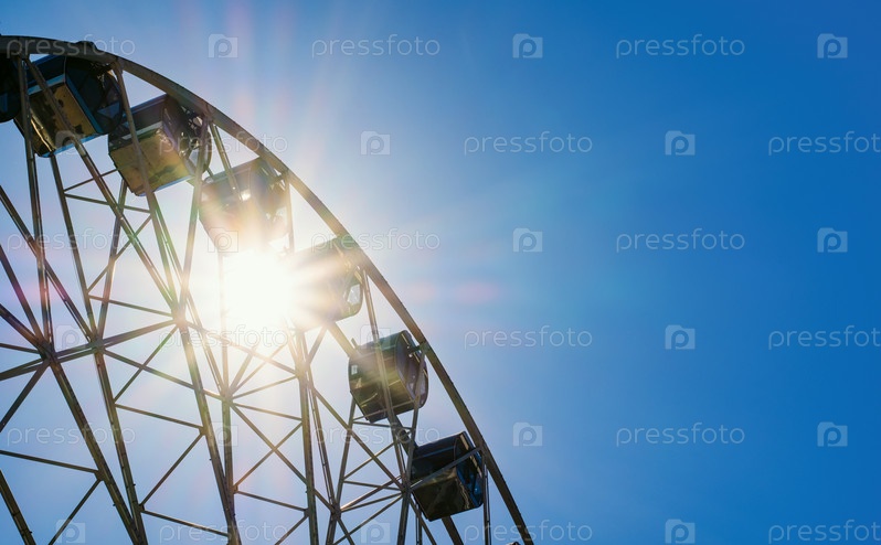 Часть колеса обозрения на фоне неба и яркого солнца. Свободное место справа для текста