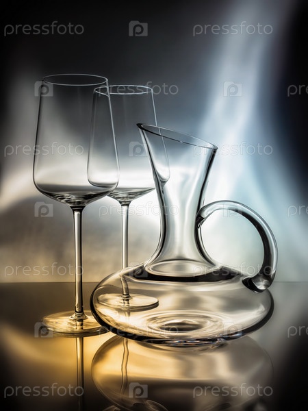 Натюрморт из двух пустых стеклянных прозрачных стаканов и графина для вина на зеркальном столе в потоках теплого и холодного света. вертикальный. студийный снимок. Изобразительное искусство. Дизайн. Плакат. Реклама