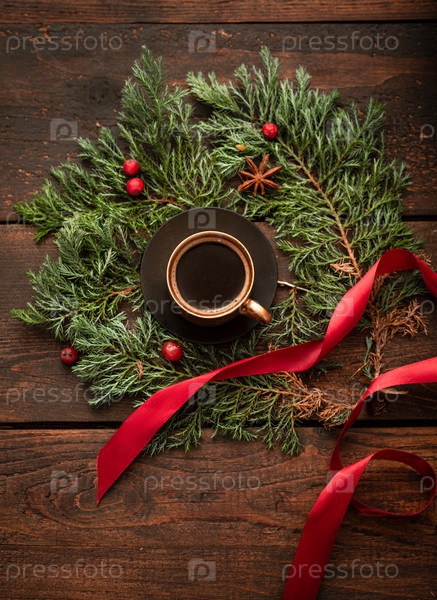 Золотая чашка кофе среди веток хвои. Новогодний декор