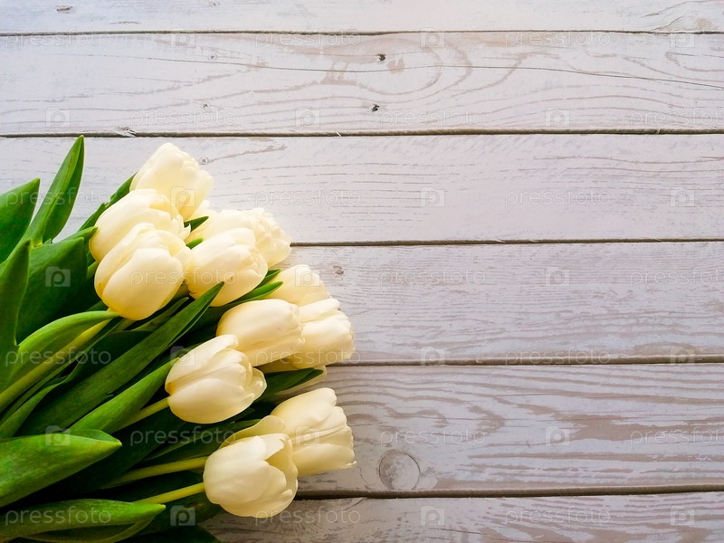 Букет белых тюльпанов на светлом деревянном фоне. Весна. Место для текста