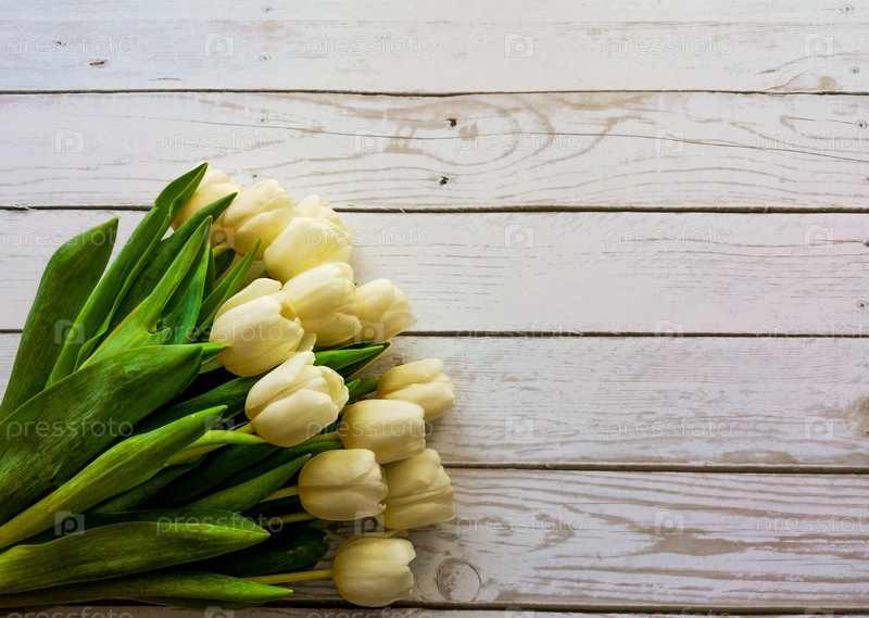 Букет белых тюльпанов на светлом деревянном фоне. Весна. Место для текста
