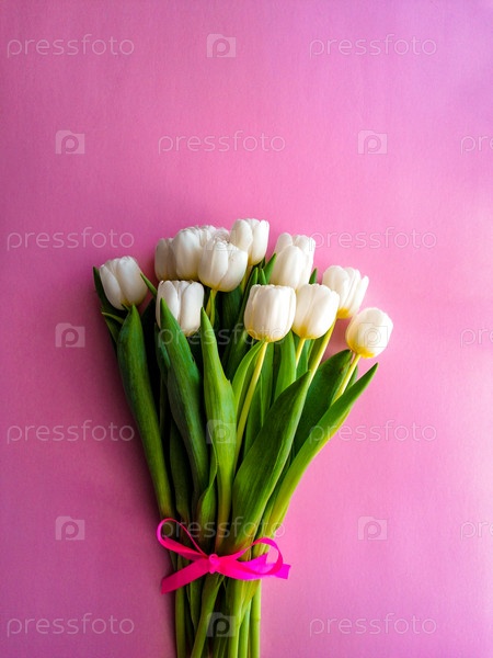 Букет белых тюльпанов, перевязанных атласной лентой цвета фуксии, на розовом фоне