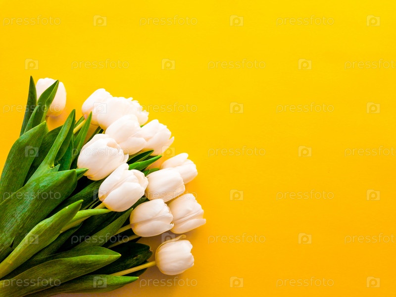 Букет белых тюльпанов на желтом фоне. Весна. Место для текста