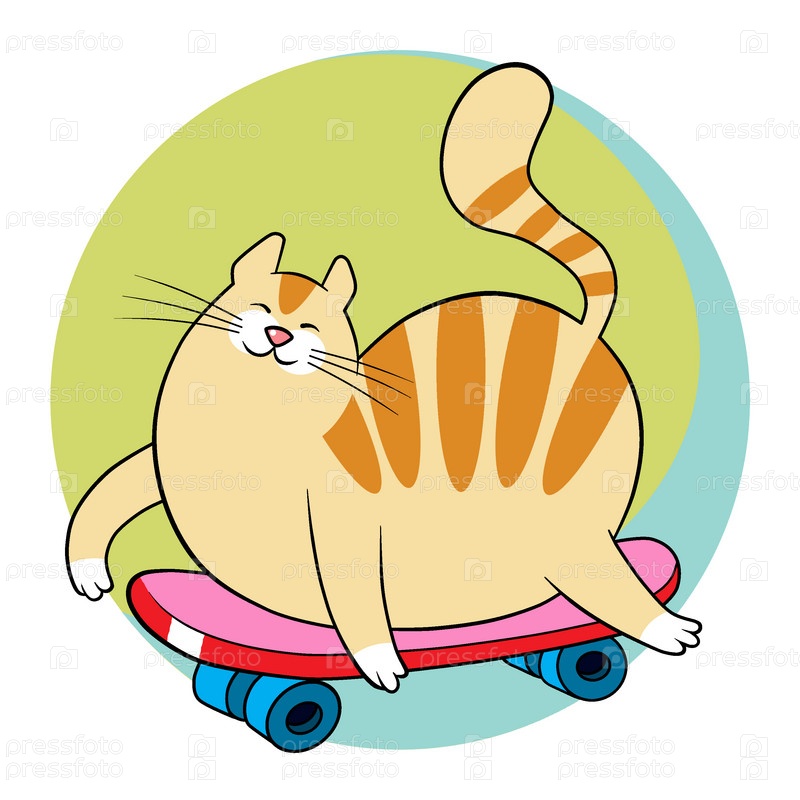 Счастливый кот на роликовой доске . Шутливая иллюстрация для оформления наклейки, открытки, праздника, блокнота, тетради и т.д
