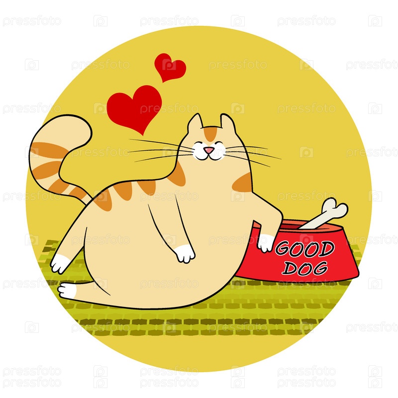 Счастливый кот с собачьей миской и костью. Шутливая иллюстрация для оформления наклейки, открытки, праздника, блокнота, тетради и т.д