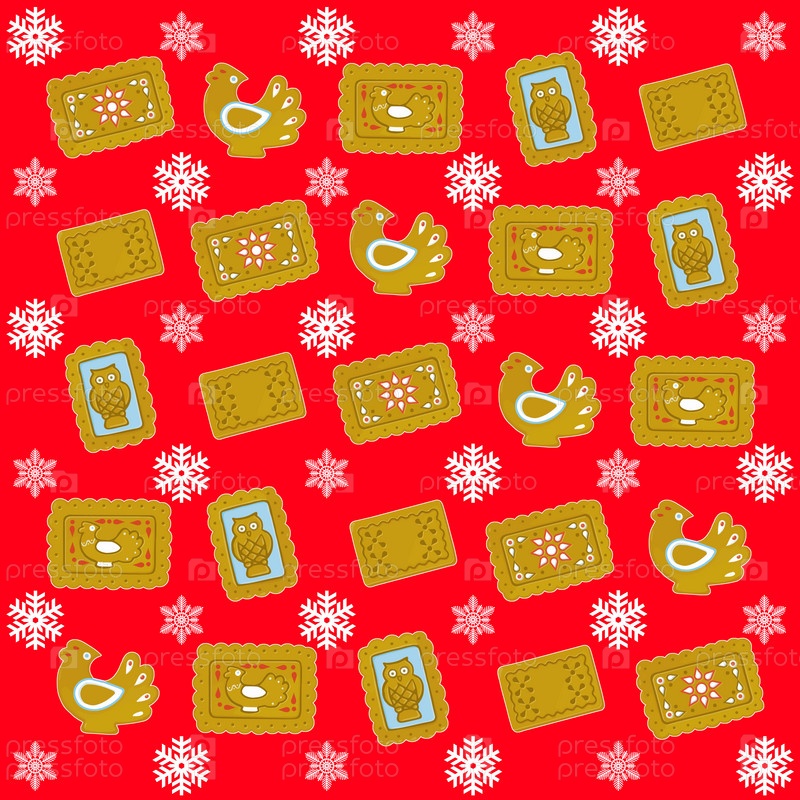 Новогодний фон с печеньем, пряниками и снежинками для упаковки подарков, открыток, тканей и т.д. на красном фоне