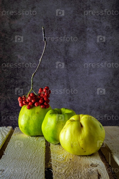 Три плода айва за дощатом столе в красной рябине букет пучка