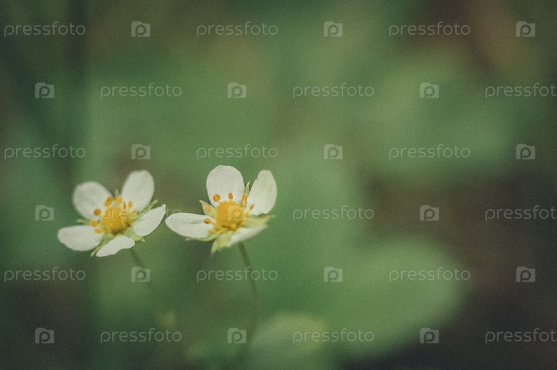 Крупный план пары цветков лесной земляники. Зернистость пленки в стиле старой фотографии. Селективный фокус, зернистость пленки