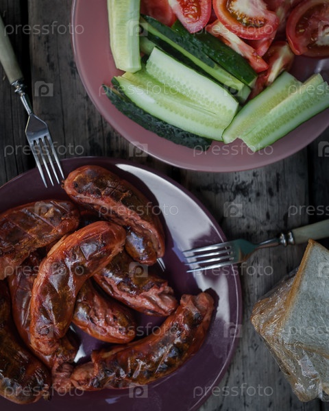 Вид сверху на горячие колбаски с гриля и нарезку овощей. Выборочный фокус. Вариант сервировки блюда на деревянном столе