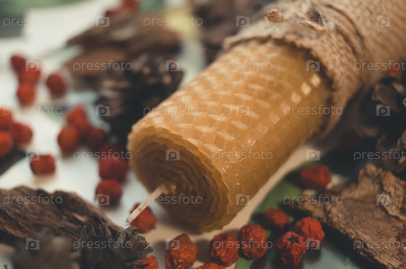 Восковая свеча ручной работы крупным планом. Праздничный декор из ягод и коры
