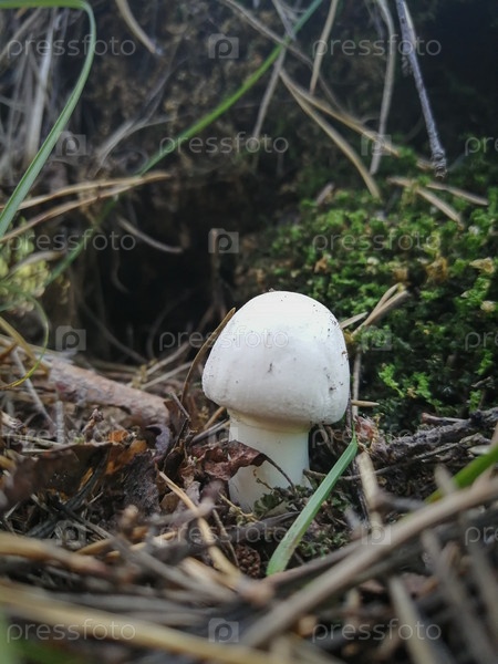 Молодой грибной шампиньон среди опавшей хвои. Съедобный лесной гриб. Выборочный фокус