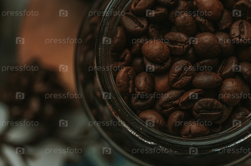 Вид сверху на размытые жареные кофейные зерна в стеклянной банке. Выборочный фокус
