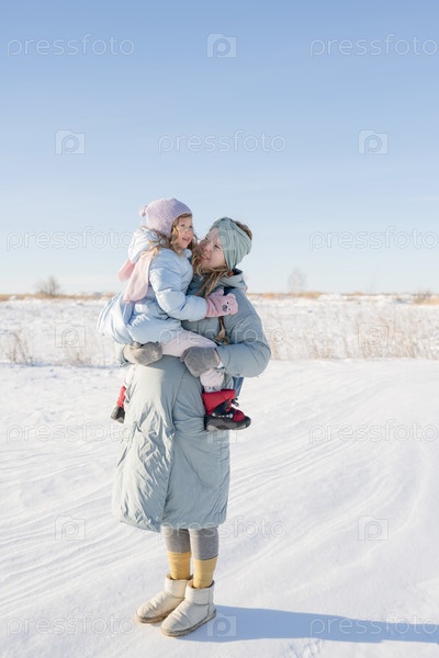 Беременная молодая женщина держит дочь на руках, стоя на природе зимой