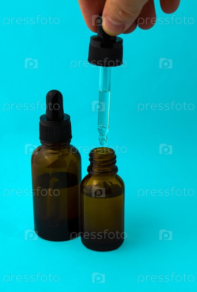 Стеклянные флаконы на синем фоне. Женская рука держит пипетку