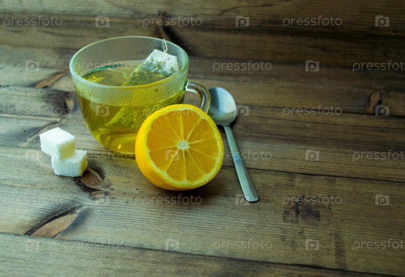 Зеленый чай с лимоном в кружке, сахаре и ложке