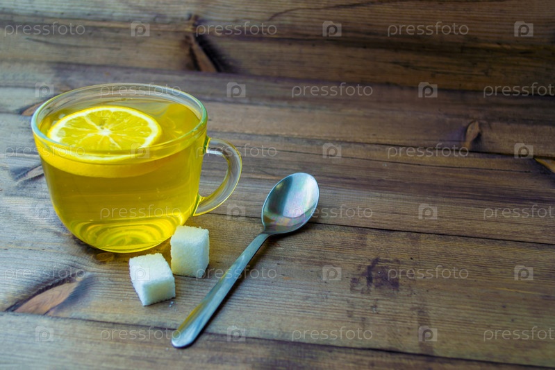 Зеленый чай с лимоном в стеклянной кружке, сахаре и ложке