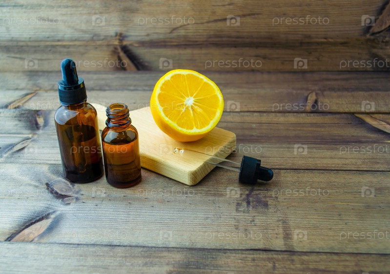 Стеклянные флаконы с пипеткой и лимоном на столе