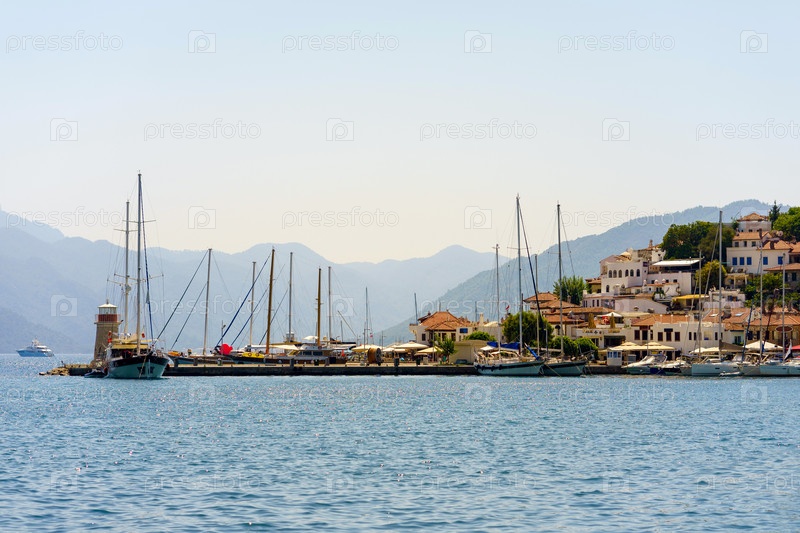 Порт Мармариса в полдень. Стоянка катеров и яхт. Панорама города