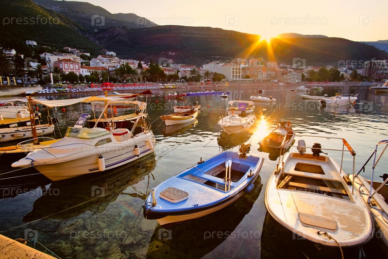 Рыбацкие лодки и лодка стоят у пристани на рассвете