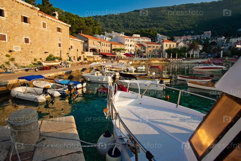 Рассвет в Черногории. Рыбацкие лодки стоят в порту утром