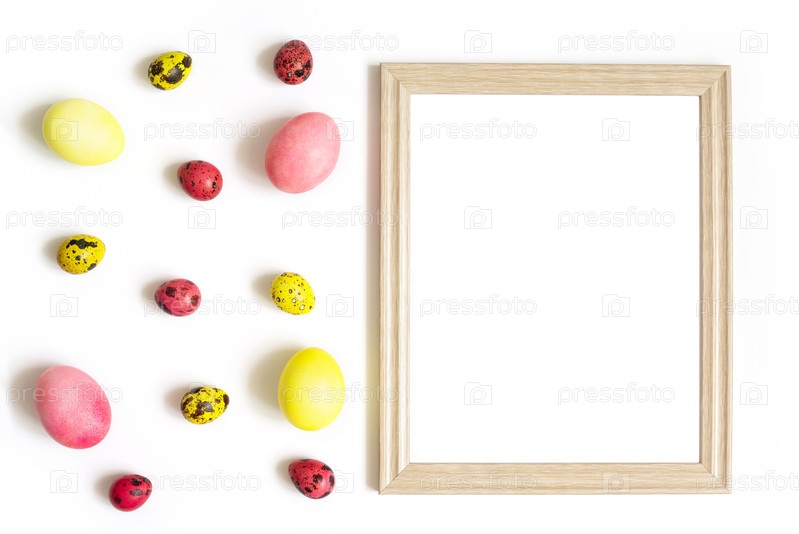 Пасхальная рамка с красочными перепелиными и куриными яйцами на белом фоне. Скопируйте пространство, плоская планировка