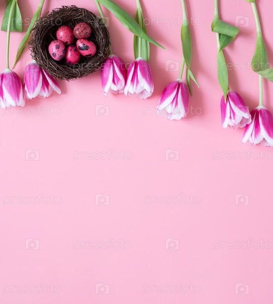 Розовая пасхальная граница с перепелиными крашеными яйцами в гнезде и тюльпанами. Вертикальный формат. Розовый фон. Скопируйте пространство, вид сверху, плоская планировка