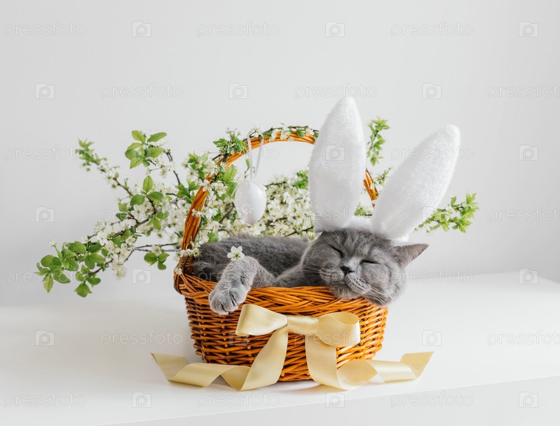 Пасхальный кот с кроличьими ушами спит в корзине на белом фоне. Пасхальная композиция с милой британской короткошерстной кошкой. Забавные питомцы