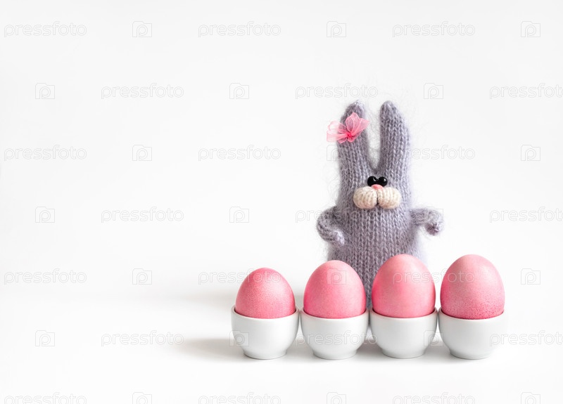 Пасхальная композиция с розовыми яйцами на подставках и пушистым вязаным кроликом на белом фоне. Место для текста