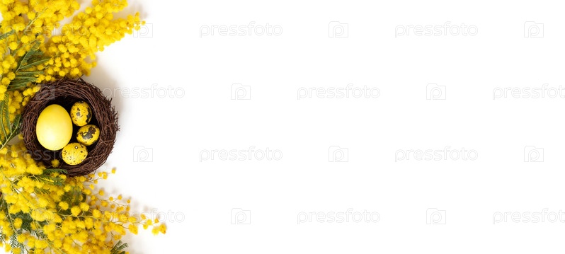 Пасхальная композиция с желтыми яйцами в гнезде, ветвями желтой акации на белом фоне. Скопируйте пространство, вид сверху