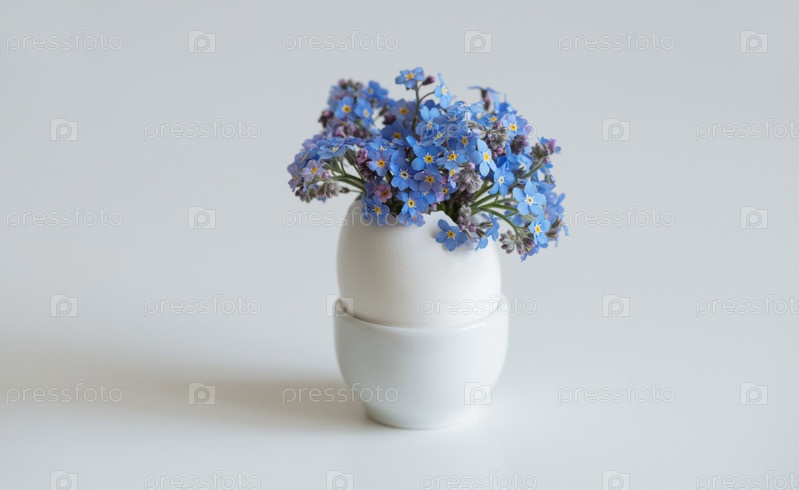 Маленькое белое яйцо с букетом цветов на белом фоне. Пасхальное яйцо. Скопируйте пространство
