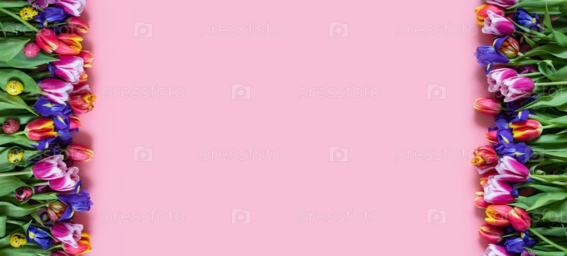 Пасхальная граница с весенними цветами и красочными перепелиными яйцами на розовом фоне. Баннер. Скопируйте пространство, вид сверху