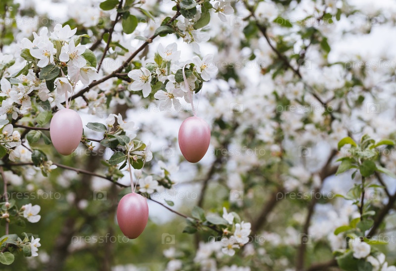 Пасхальные розовые яйца на цветущих ветвях яблони. Пасхальный фон