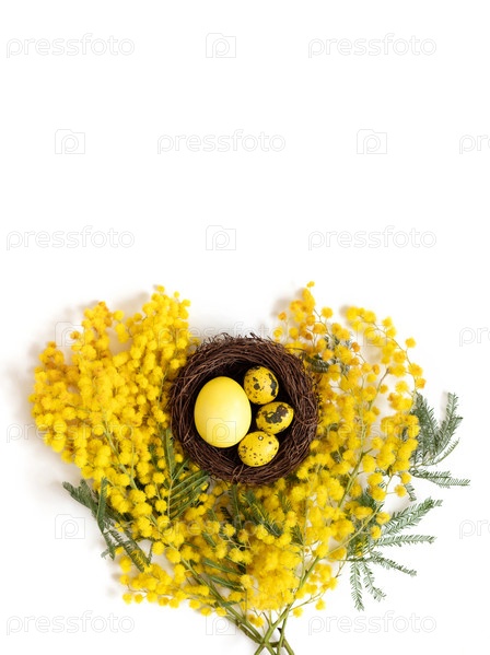 Пасхальная композиция с желтыми цветами акации и яйцами в гнезде на белом фоне. Вертикальная ориентация. Место для текста