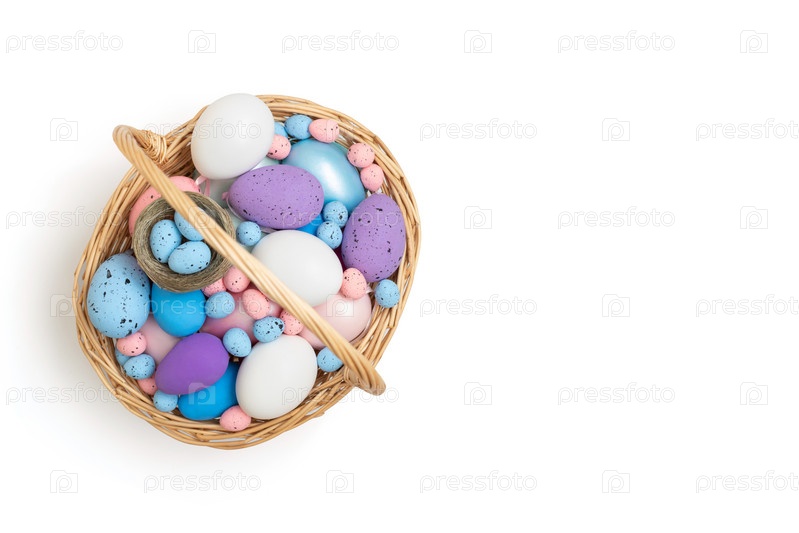 Пасхальные яйца в корзине, изолированные на белом фоне. Праздничный декор. Место для текста. Вид сверху, плоская планировка