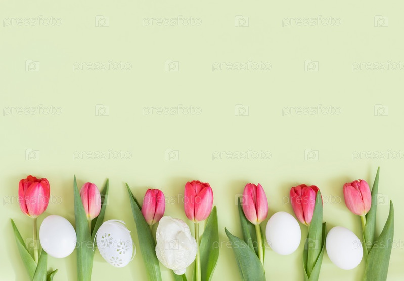 Пасхальная граница с розовыми тюльпанами, белыми яйцами и кроликом на зеленом фоне. Красивая пасхальная композиция. Место для текста. Вид сверху, плоская планировка