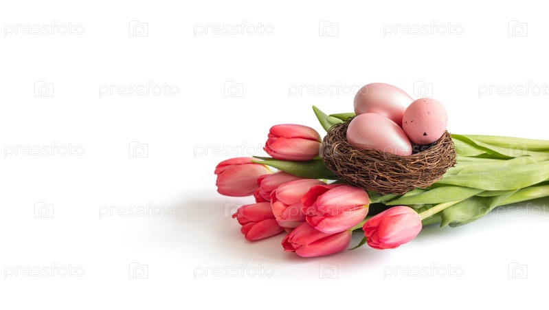 Пасхальные розовые яйца в гнезде и букет тюльпанов, изолированные на белом фоне. Баннер. Пасхальная открытка. Скопируйте пространство