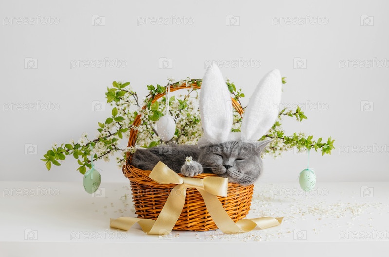 Спящая кошка с кроличьими ушками в цветочной корзине. Пасхальная открытка с британской короткошерстной кошкой. Красивая пасхальная композиция