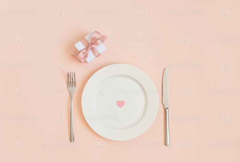 Праздничная сервировка стола с сердцем в тарелке и подарком на розовом фоне. Романтический или свадебный ужин. День святого валентина или день матери фон