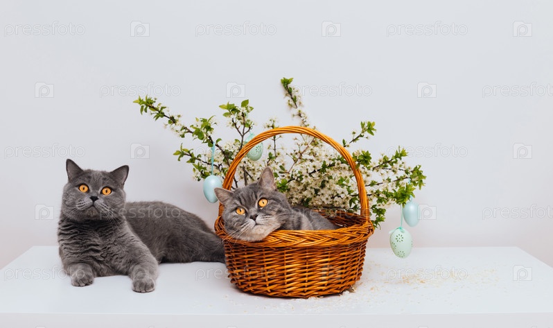 Пасхальные коты в корзине с цветами. Британская короткошерстная и шотландская прямоухая кошка. Забавные питомцы. Скопируйте пространство