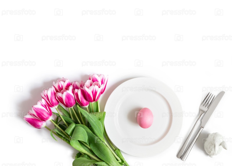 Сервировка праздничного пасхального стола с розовыми куриными яйцами, кроликом и тюльпанами на белом фоне. Скопируйте пространство, вид сверху