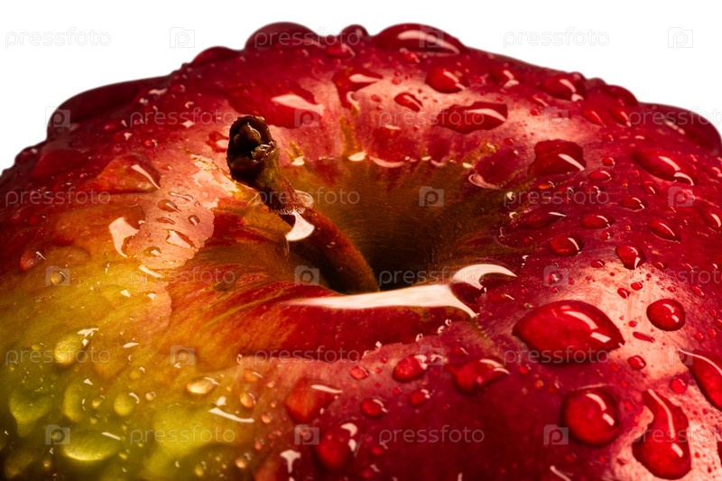Красное, спелое яблоко в каплях воды крупным планом