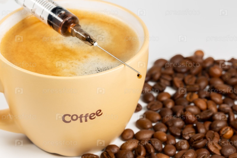 Чашка кофе, кофейные зерна и крупный план шприца. Концепция зависимости от кофе