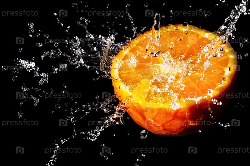 Брызги воды на сочном ярком апельсине. Темный фон