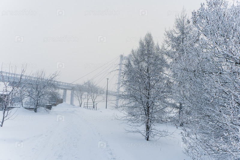 В парке на берегу Енисея в центре Красноярска в сильный мороз