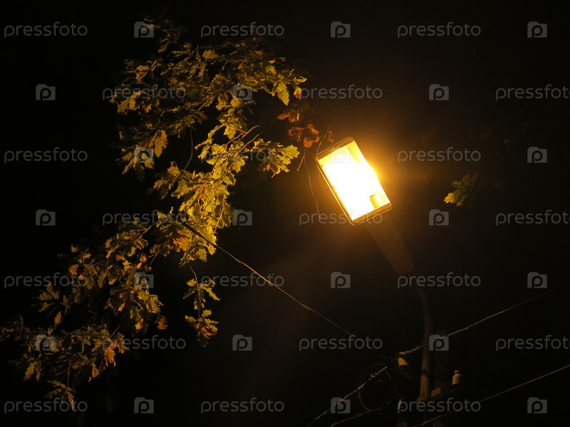 Уличный фонарь освещает ветку дуба осенью