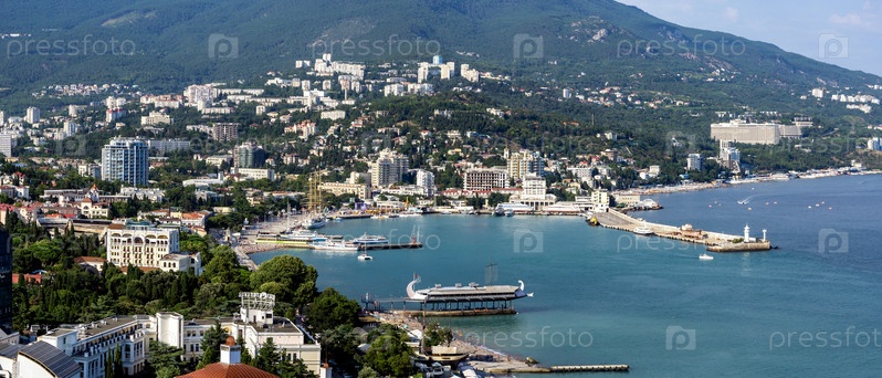 Отличная Ялтинская бухта с видом на горный хребет и маяк